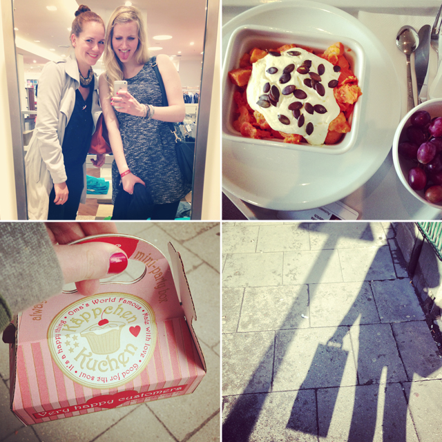 (9) Völlig erschöpft nach der Gala Shopping Night. Meine herzallerliebste Co-Praktikantin Luisa und ich konnten kaum noch stehen! // (10) Das leckerste Kantinenessen überhaupt: vergangene Woche gab es Karotten-Süßkartoffel-Ziegenfrischkäse-Auflauf. // (11) Bevor ich diesen Montag mit dem Projekt "Kein-Nachtisch-für-die-nächsten-4-Wochen" begann, musste am Wochenende ein allerletztes Mal gesündigt werden, und zwar mit den besten Cupcakes in ganz Hamburg! // (12) Auf frischer Tat ertappt! Für den Frühling musste geshoppt werden!